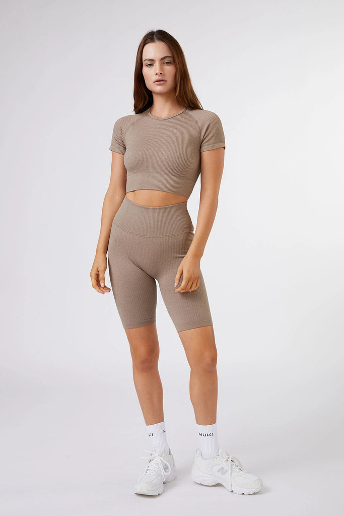 Seamless Ribbed Short Sleeve Crop Top in Latte