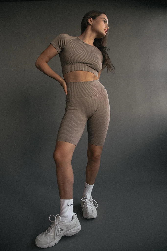 Seamless Ribbed Biker Short in Latte