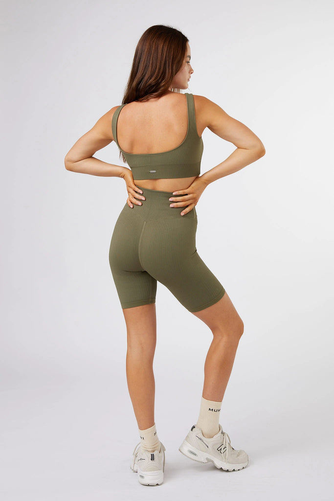 Introducing our latest addition to the athleisure wardrobe, the Seamless Ribbed Biker Short in Olive Green. With a new and improved design and an expanded size range, these biker shorts are a must-have for your fitness and leisure activities. Crafted with a seamless construction and utilising high-performance ribbed fabric, they offer maximum comfort and flexibility. The sleek and flattering silhouette ensures a confident and stylish look, perfect for yoga, gym sessions, and everything in between.
