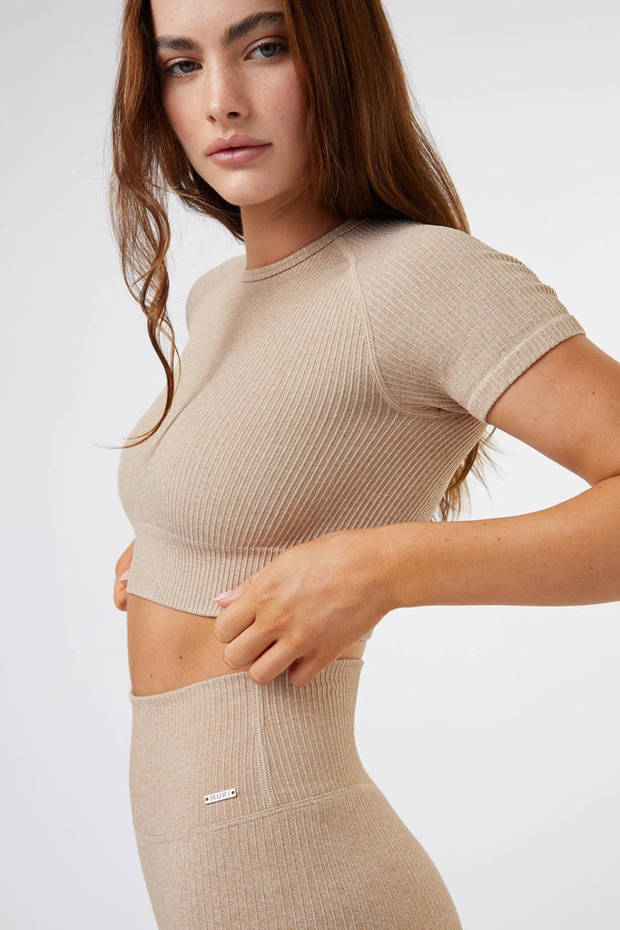 Seamless Ribbed Short Sleeve Crop Top in Beige