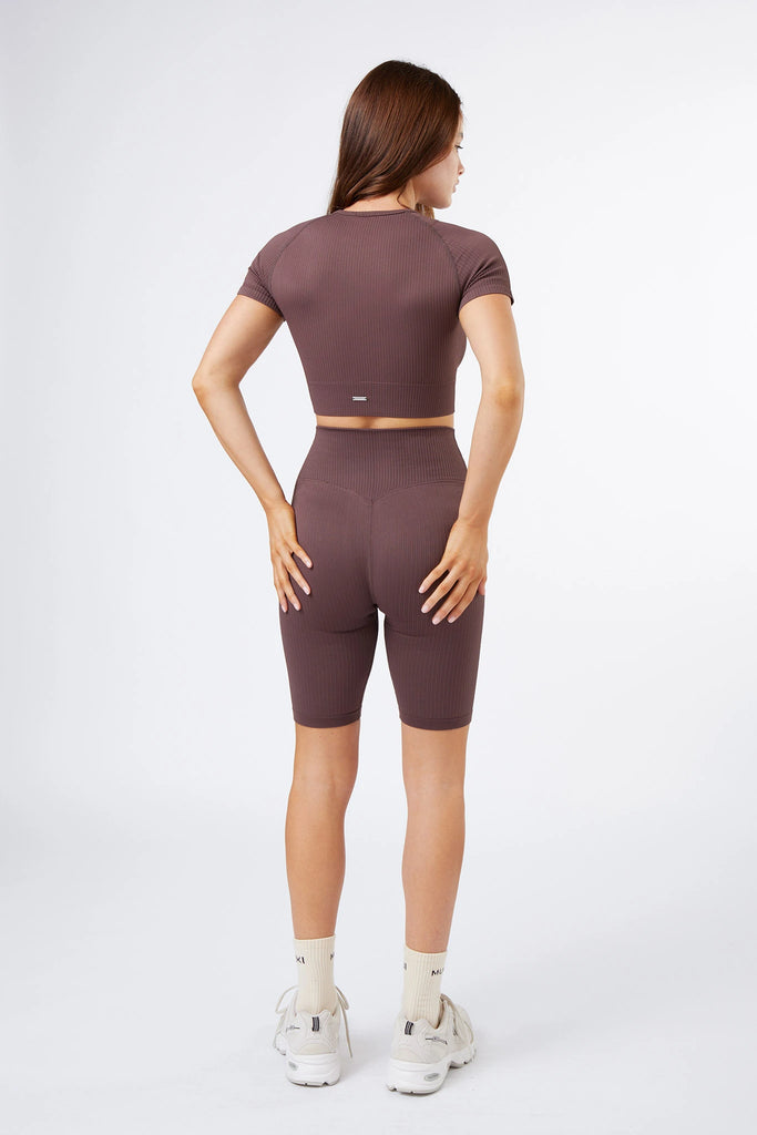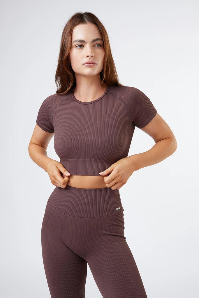 Seamless Ribbed Short Sleeve Crop Top in Chocolate